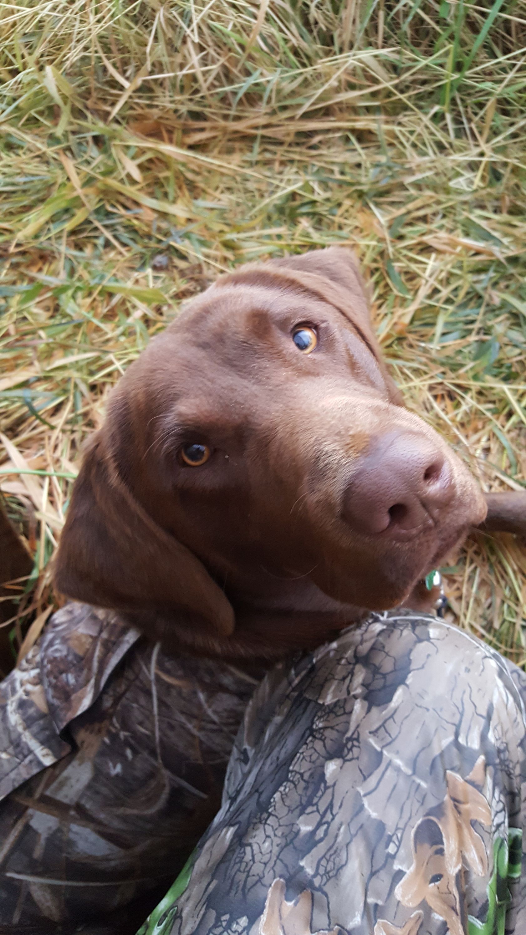 Bear is your classic bird dog. He is very commandable and eager to please his owner. Bred to retrieve, he is an outstanding water fowl dog. He is patient in the duck blinds and quick to dive in for retrieval. Bear is very observant, looking to the skies for birds while outside. He also makes a great companion in the home.